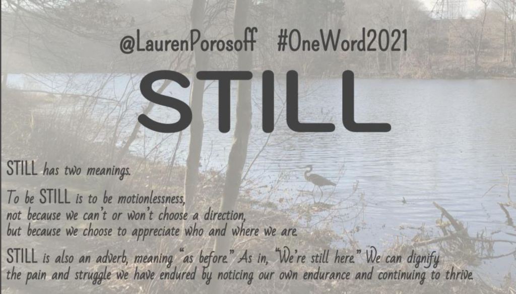 Lauren Porosoff was very thoughtful in sending along her #OneWord2021. Please take a minute, check out her creative graphic and the two meanings behind the word ‘still.’